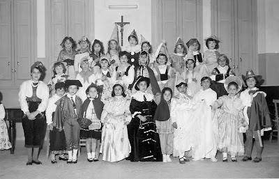 Gli scolari con i grembiulini e i compagnetti, componenti del Coro con i costumi tradizionali siciliani: Lino Romagnosi, Ingargiola, Amabilino, Salvatore Moretti, Giovan Battista Quinci, Salvatore Perniciaro, Bartolomeo Tumbiolo, Tommaso Guida, Gena Vito, Quinci Calogero?, Vincenzo Mauro, Giuseppe Marino?, Giuseppe Perniciaro, Pasquale Pietrobono, Enzo Quinci, Peppe Parrinello, Gino Montallegro, Rizzo, Giovanni Napoli, Rino Di Giorgi, Dilluvio, Salvatore Pipitone, Giuseppe Pecoraro, Nicola D'Aleo, Giuseppe Mulone